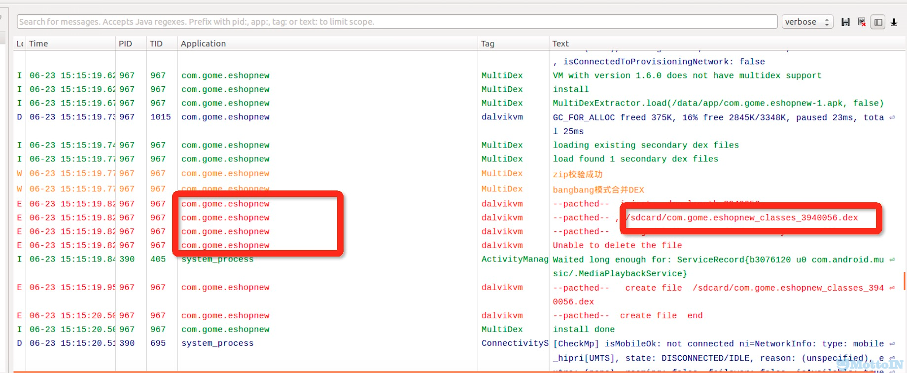 coredump文件中搜索“dex.035”