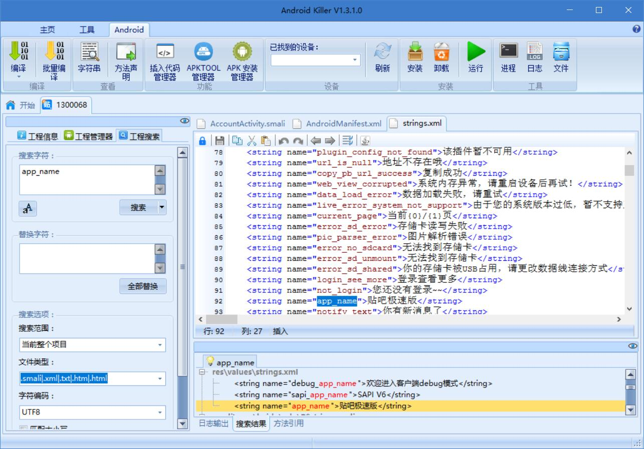 现在你可以使用软件的搜索、替换等功能来对源代码进行修改,这种修改包括汉化、去广告、改名、替换资源、图片、xx 等等。下图中各个图标按钮都有提示文字,可以将鼠标悬浮在按钮上显示文字提示。具体的各项说明会单独写个文章来详细解释,基本上也没什么难点。