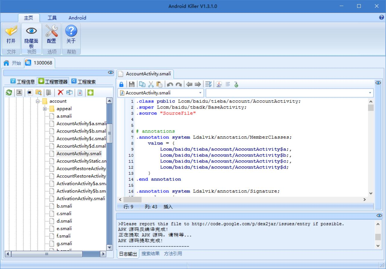等一会儿,我们会看到反编译完成。之后切换到“工程管理器”,可以看到项目的结构,点击其中的文件可以在右边看到文件内容: