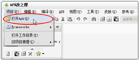 单击菜单“项目->打开Apk”选择要修改的 Apk 文件(注:文件名称必须只有字母、数字、下划线、空格、点号等组成,不能包含中文或其它亚洲字符)。