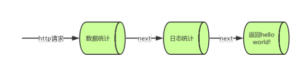 //整个请求处理过程就是先数据统计、日志统计,最后返回一个Hello World!