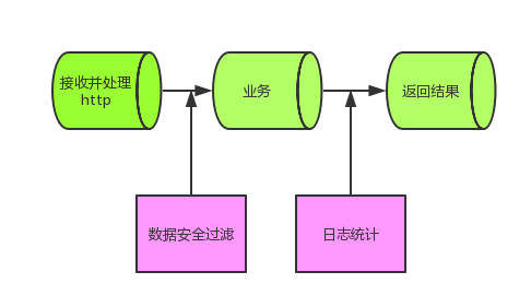 根据上图,整个响应http过程可以看做是一条串联的管道,对于每个http请求我们都想插入相同的逻辑例如数据过滤、日志统计的目的,为了不和业务逻辑混淆一块,提高代码复用率,AOP提倡从横向切面思路向管道某个位置插入一段代码逻辑,这样就实现在任何业务逻辑前后都有相同代码逻辑段,开发者只需专注写业务逻辑,既不影响整个响应http过程,而且隔离了业务逻辑,实现高内聚低耦合原则。