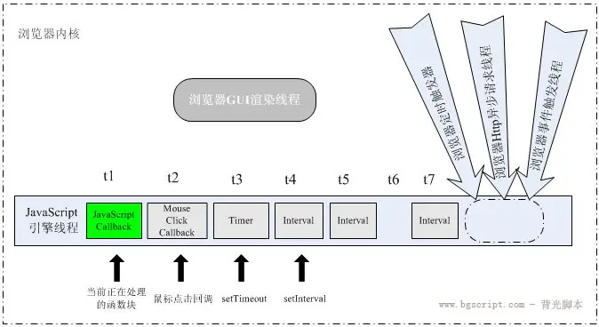 - 浏览器的内核是多线程的,它们在内核制控下相互配合以保持同步,一个浏览器至少实现三个常驻线程:javascript引擎线程,GUI渲染线程,浏览器事件触发线程。