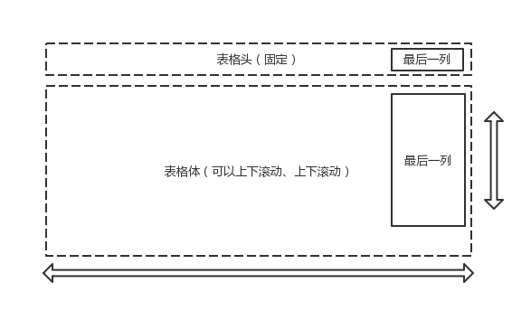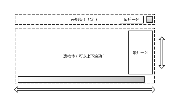 原来,因为我们允许表格体上下滚动,使得在容器右侧出现了一个纵向的滚动条。而表头因为我们希望他是固定的,因此放在了另一个容器中,这导致他不能共享这个滚动条。因此,这使得表格体拉到头的时的 scrollLeft 也正好是表格头到头的位置,两个到头的位置上差了一个滚动条的宽度!看到这里,也许有的小伙伴可能会开始自己操练起来看看是不是这样,然后发现并没有类似问题,大呼坑爹,他们看到的情况大致如下图: