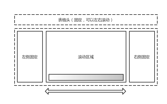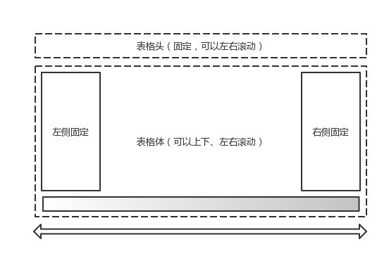 解决了上面两个问题之后,一个完整的支持表头固定和横向滚动的表格就完成了。接下来又有了新的需求,要在原有表格基础之上,支持左右侧列固定。这也是表格中比较常见的需求,一些数据列或者操作列处于高频使用下,希望能够固定,这时就产生两种处理表格体横向滚动条的方式。