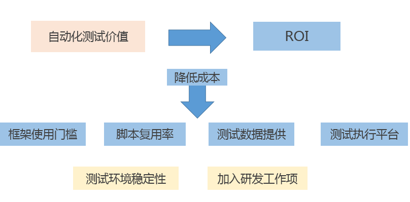 因此涉及到的核心问题就是ROI,很多团队无法将UI自动测试一直坚持做下去主要的原因也是ROI无法达到预期。所以需要我们思考如何降低UI自动化的实施成本,其中包括开发成本和运行成本。