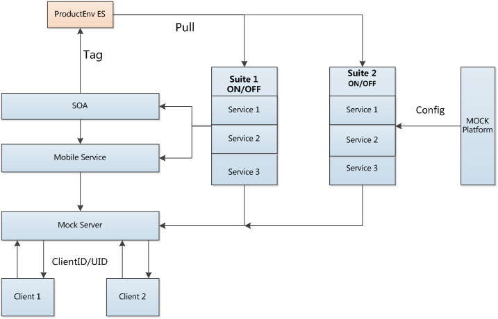 • Mock 作为统一数据源接入两套被测系统测试环境