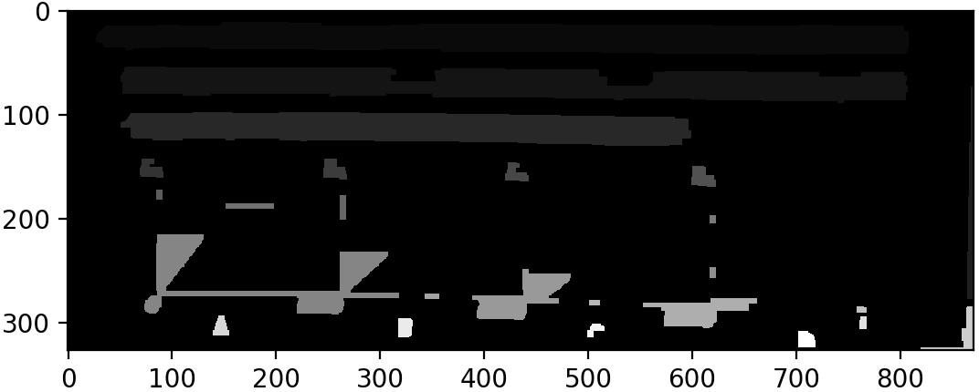 接下来可以利用scipy库中的measurements.label方法,标记出不同的的区域,下图展示了标注后的效果,不同区域以不同的灰度表示。