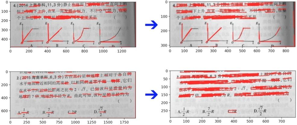调整的目的是为了让图像中文字的尺寸保持大致相同的像素尺寸。这里做了一个简单假设,即:图像基本是一段完整的文本,比如一个段落,或者一页文档,那么不同的图像中,每行文本的字数相差不会很大。这样我就可以从我所了解的、少得可怜的图像工具库里找到一个工具了:直线拟合。即通过拟合的直线(线段)长度与图像宽度的比例,调整图像的大小。下图为两张不同尺寸图像,经过多次拟合+调整大小后的结果,其中红色算法检查到的直线(线段)。