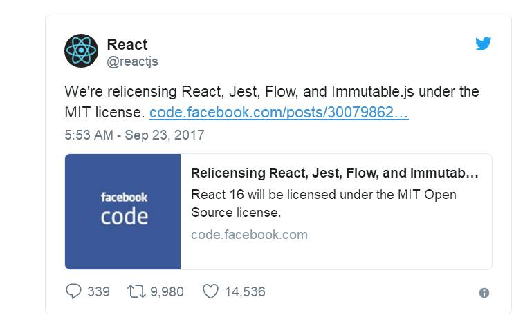 Facebook 将重新授权开源项目,将 React、Jest、Flow 和 Immutable.js 协议更改为 MIT license。因为意识到 React 是 Web 开源生态基础的重要组成,不希望因为非技术的原因而阻止其发展。