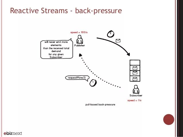 背压(Backpressure)支持:简单来说,背压就是一种反馈机制。在一般的 Push 模型中,发布者既不知道也不关心订阅者的处理速度,当数据的发布速度超过处理速度时,需要订阅者自己决定是缓存还是丢弃。如果使用 RP,决定权就交回给发布者,订阅者只需要根据自己的处理能力问发布者请求相应数量的数据。你可能会问这不就是 Pull 模型吗?其实是不同的。在 Pull 模型中,订阅者每次处理完数据,都要重新发起一次请求拉取新的数据,而使用背压,订阅者只需要发起一次请求,就能连续不断的重复请求数据。