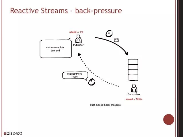 两张图乍一看没啥区别,但其实是完全两种不同的背压策略。第一张图,发布速度(100/s)远大于订阅速度(1/s),但由于背压的关系,发布者严格按照订阅者的请求数量发送数据。第二张图,发布速度(1/s)小于订阅速度(100/s),当订阅者请求100个数据时,发布者会积满所需个数的数据再开始发送。可以看到,通过背压机制,发布者可以根据各个订阅者的能力动态调整发布速度。
