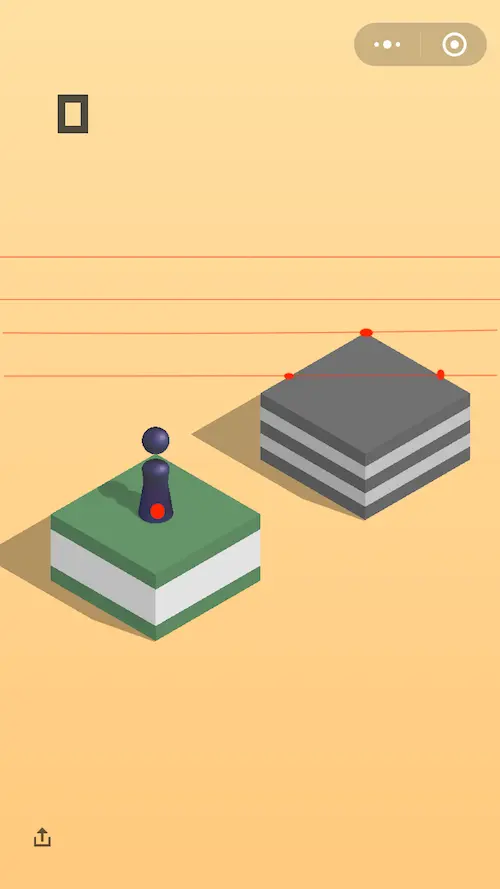 至于方块的位置就不好找了,可以利用色差来做。如上图,背景色是浅黄色,要跳的方块是深灰色,可从上到下扫描像素点,记录背景色,一旦发现有与背景色相差太大的像素点,即表示发现了目标方块,照着此颜色多找几个点,平均下得到方块的中心点。(也可直接用其他方法或用其他方式选取中点,看你自己研究了)