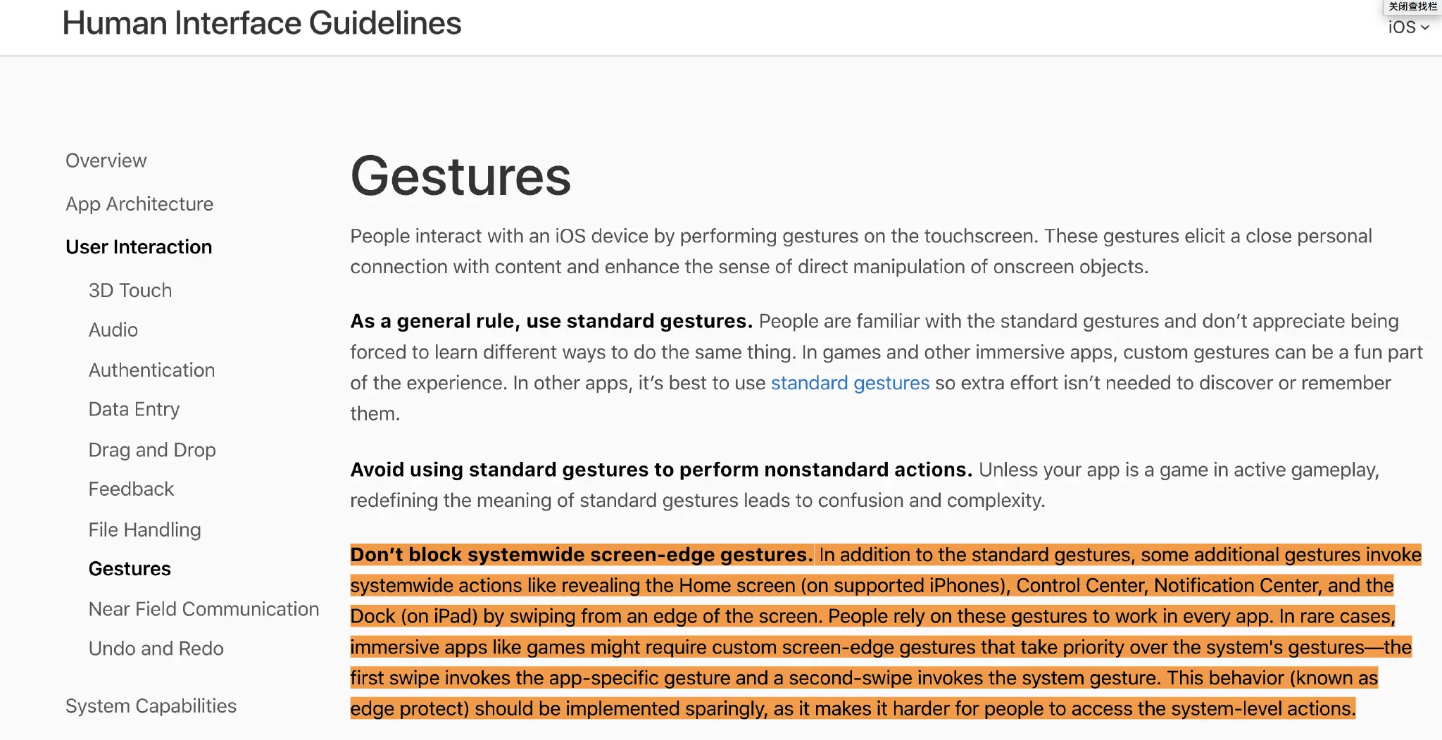虽然苹果用黑体字写着强烈不建议开发者干涉系统的手势,但是为了增强用户体验还是开出了接口,苹果管这个叫做 "edge protect" 因为进入App后系统手势都是从边缘触发,引起冲突的地方也会是在边缘中。