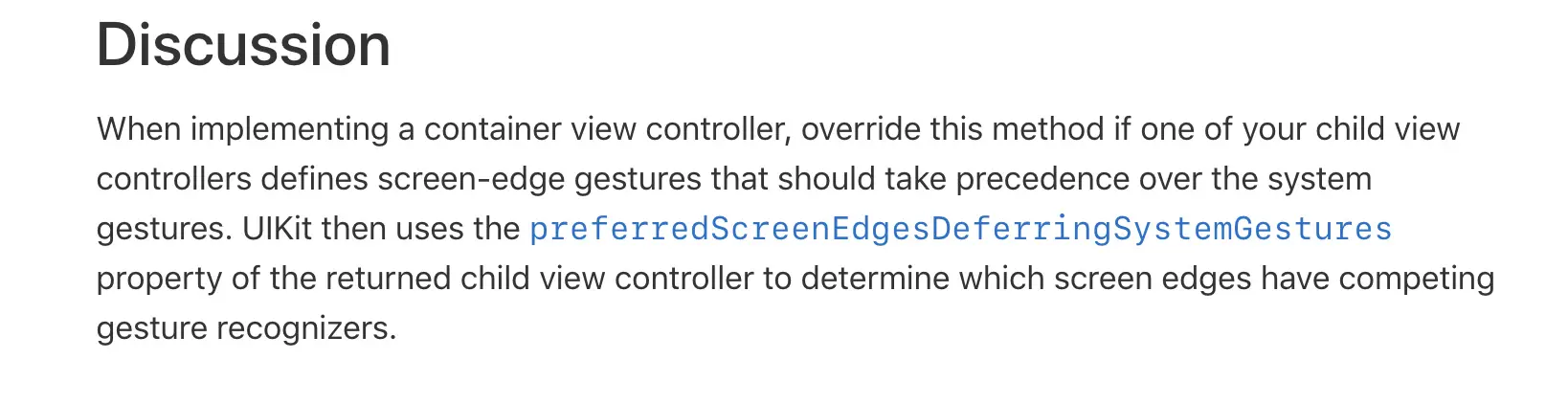 - (nullable UIViewController *)childViewControllerForScreenEdgesDeferringSystemGestures API_AVAILABLE(ios(11.0)) API_UNAVAILABLE(watchos, tvos);