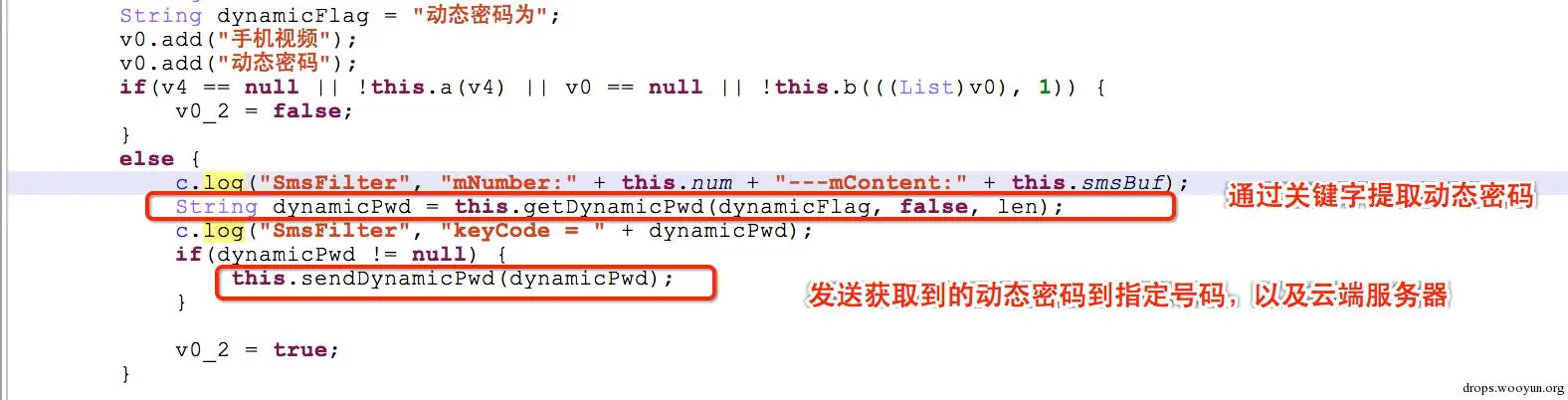 对smscheck函数分析,发现若拦截到的短信中存在动态密码,病毒会第一时间发送给指定号码,同时会将动态密码,以及当前手机信息作为参数post提交到云端服务器。也就是木马作者通过用户手机号码找回密码,这样轻松的盗取用户账号密码,而中马用户完全不知晓。