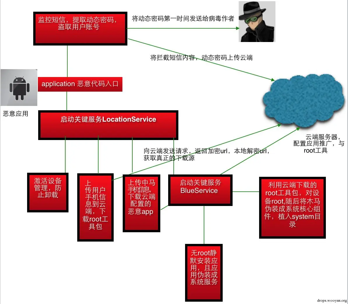 攻击者将木马制作成用户刚需应用,如色情类、生活服务类,或将恶意代码通过二次打包,注入到合法的应用当中,伪装成为合法应用,上传到android市场或某些论坛,诱导用户下载。一旦用户下载运行了此类应用,木马通过云端推送root 工具包,以及恶意应用;通过短信提取动态密码,第一时间发送给木马作者,直接造成财产损失、隐私泄露等;木马创建不死服务,后台root设备,成功root后将 恶意应用植入系统分区,用户即使恢复出厂设置也无法完全卸载木马。具体执行过程如下图: