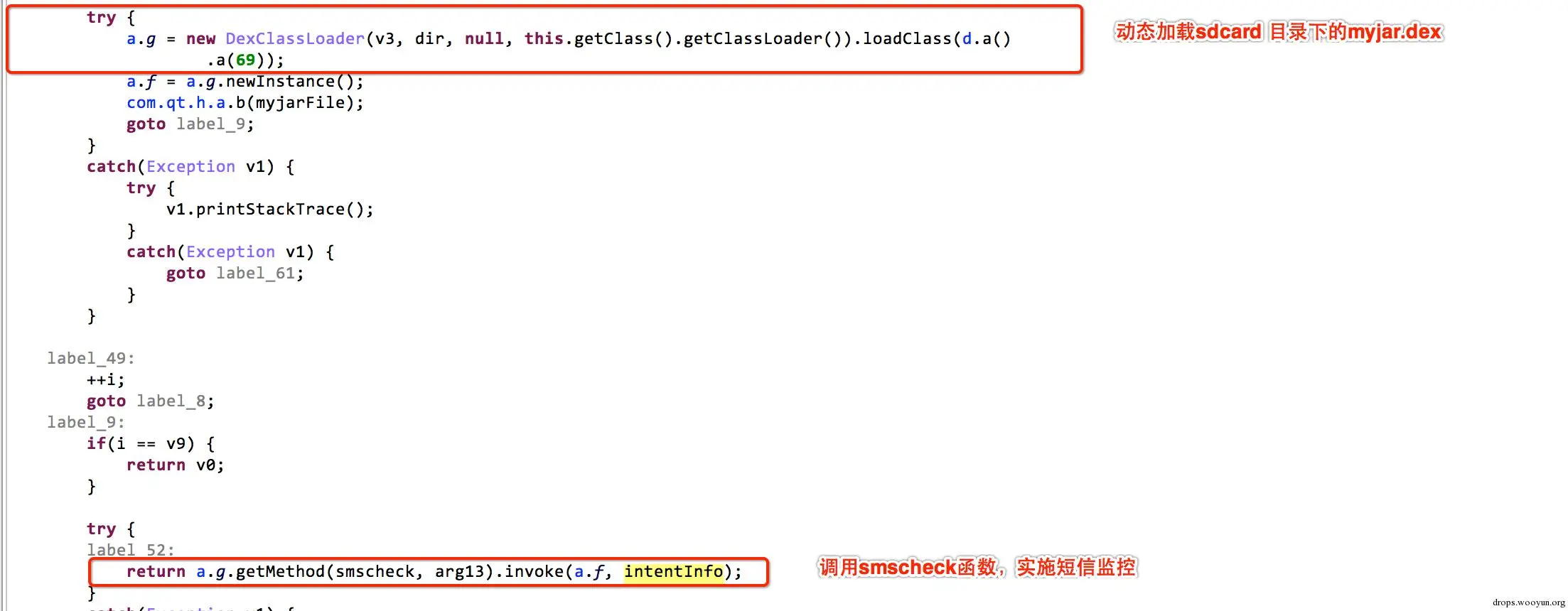 木马动态注册短信监听广播,通过类加载反射等技术进行具体的监控操作。当触发短信消息事件时,木马会动态加载myjar.jar,反射调用smscheck函数。