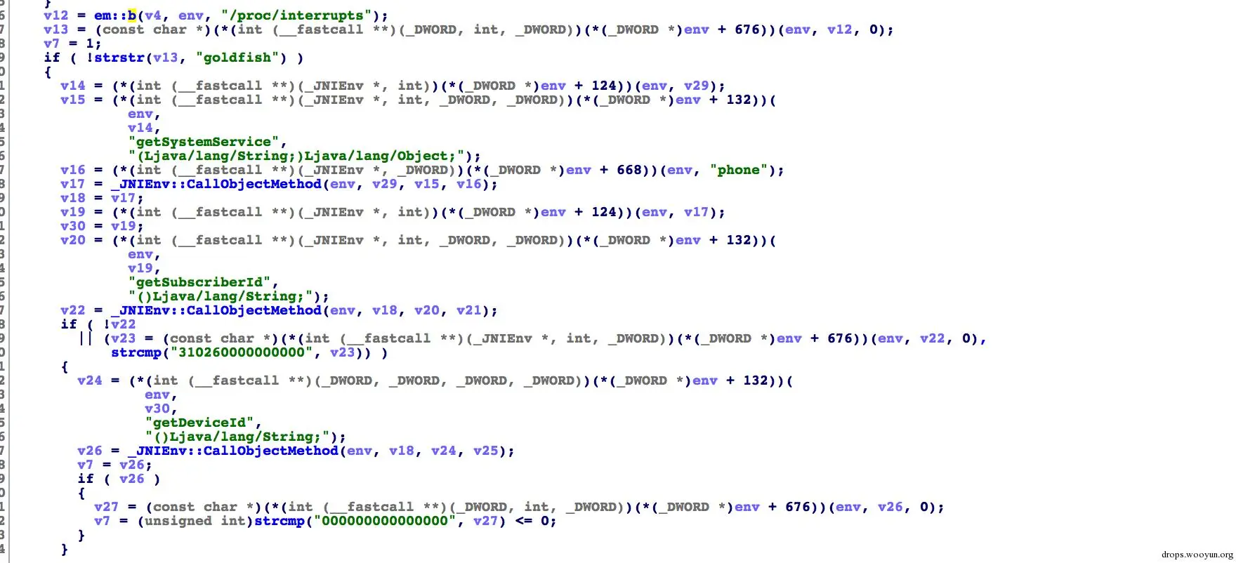 模拟器检查,若木马运行环境在模拟器内,木马将不会启动恶意广播。模拟检查主要检查cpuinfo是否为goldfish,设备IDS是不是 “000000000000000”, imsi id是不是“310260000000000“,手机运营商等。