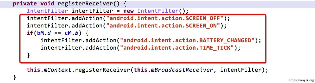 只要保证两大核心服务LocationService,BlueService 不死,就可以一直在后台执行恶意代码。木马在启动核型服务LocationService,BlueService的同时,会注册守护广播,保证核心服务一直启动。