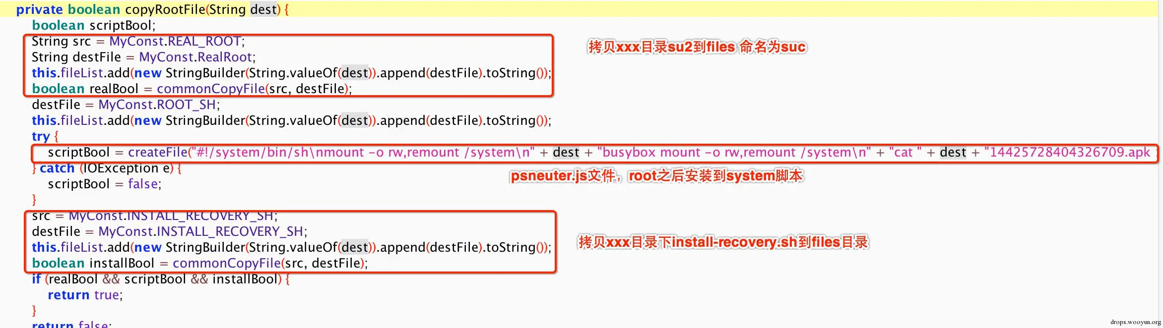 将云端下载到sdcard/.xxx目录里的busybox,su 拷贝到应用文件目录,创建aa.xml文件表示开始进行root 工作。下图创建开始root文件