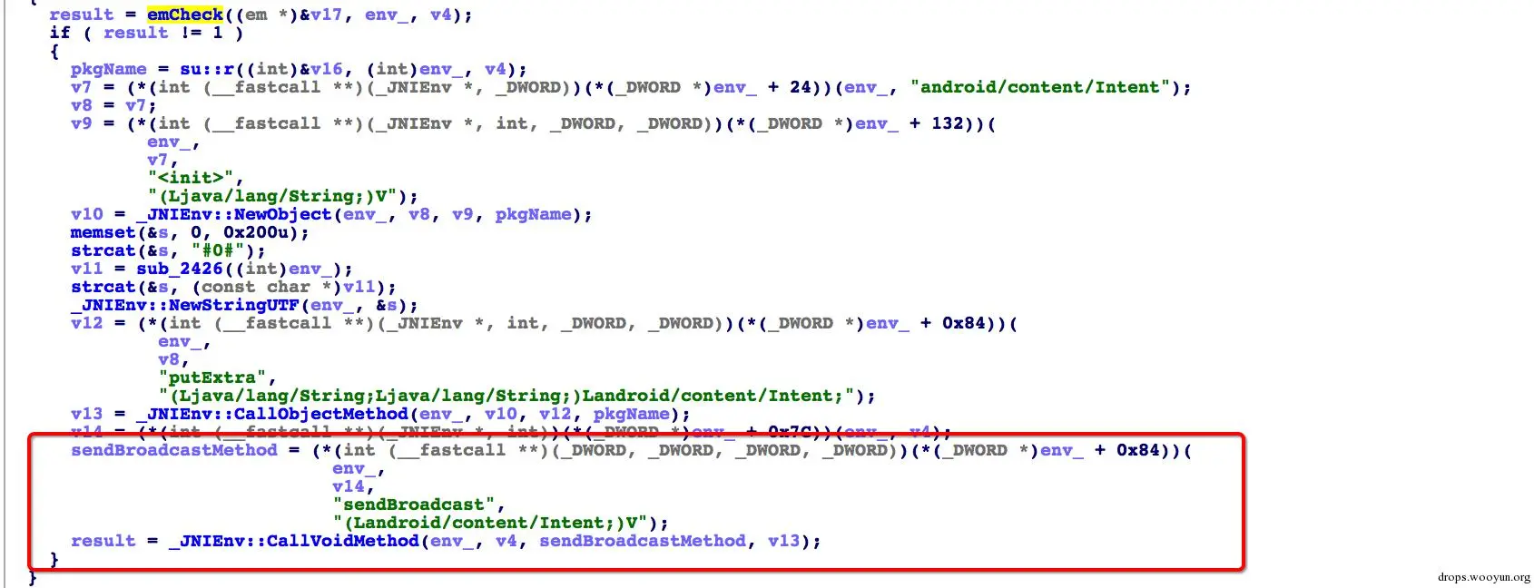 对变种木马“内涵壁纸”样本分析,首先在native层检查运行环境,若不是模拟器才启动恶意广播。这样有效的躲避了动态引擎检测,以及逆向分析人员分析。