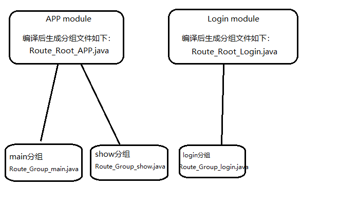 我们定义两个接口来对生成的java文件进行约束,IRouteGroup是生成的分组关系契约,IRouteRoot是单个分组下路由信息契约,只要我们生成的java文件分别继承自这两个接口并实现loadInto()方法,在运行期间我们就可以统一的调用生成的java文件,获取路由映射信息。在上文中我们时不时的提到分组信息和路由映射信息,其实两者都是通过javapoet生成的类文件,理论上我们只需要生成一种文件,即记录路由地址和Activity一一映射的文件,但是一个项目中众多的路由地址没有任何分组,会很难辨别,所以我们对路由进行分组,下面我用一张图来说明分组和路由的关系: