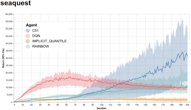 基准测试 对于新手研究人员来说,能够根据既定方法快速对自己的想法进行基准测试是至关重要的。 为此,我们在 ALE 学习环境支持的 60 款游戏中提供四个智能体的完整训练数据,格式为 Python pickle 文件(对于使用我们的框架训练的智能体)和 JSON 数据文件(用于对比其他框架训练的智能体); 我们还提供了一个网站,方便研究人员可以快速查看所有 60 款游戏中提供的智能体的训练运行情况。 下面我们将展示在 ALE 学习环境下支持的 Atari 2600 游戏之一 Seaquest 上的 4 个智能体的训练情况。