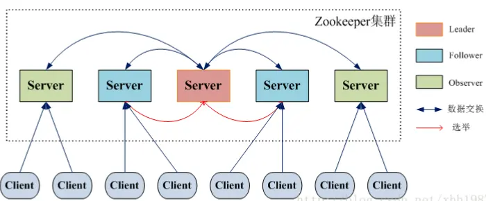 但是,在 ZooKeeper 中没有选择传统的 Master/Slave 概念,而是引入了Leader、Follower 和 Observer 三种角色。如下图所示