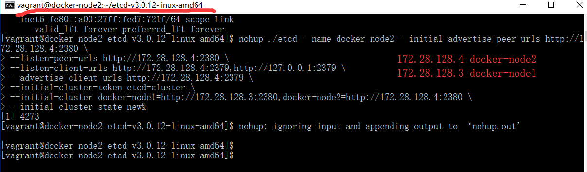 nohup ./etcd --name docker-node1 --initial-advertise-peer-urls http://172.28.128.4:2380 \
