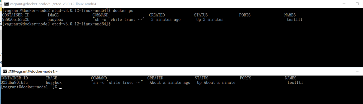 - docker-node1 和 docker-node2 共同操作查看状态
