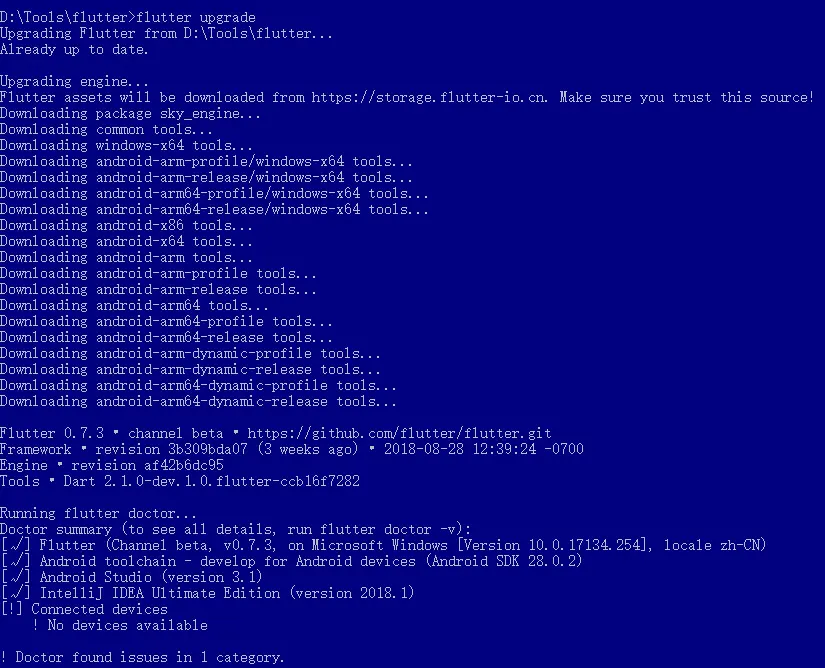 重启电脑后CMD进入Flutter目录,执行flutter upgrade