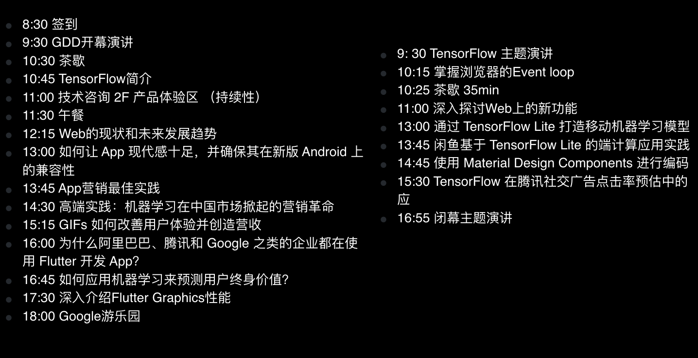 GDD 这次时间安排的相对紧凑。主会场和分会场不少时间段都同时开展演讲,因此有意识的安排好自己的行程,对参加演讲十分有帮助,另外也可以也会根据现场情况临时调整安排。会前我根据GDD 官方的日程表,选择了一些自己感兴趣的topic,从机器学习的TensorFlow、Flutter、Web,从技术性讲演和商业讲演,都有所涉及,突出一个广字。事实证明,这种选择并非正确,很多高大上的标题,不一定有实质性的干活。反而是分会场的一些场次,技术性内容比较强。