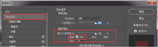 2. 复制图层,点击添加图层样式,选择混合选项,在高级混合里面的通道选项,有R、G、B三个通道选项,默认是全部勾选的状态,选择其中一个勾掉(关于通道应该选择哪一个或者哪几个,可以挨个尝试一下,勾选一个或两个,位移之后的颜色也是不同的)。然后回到图层中,向左移动(移动大概几个像素的距离,让图层有略微的错位感,注意:如果错位过大容易眼晕,需根据情况来调节);