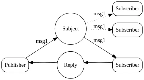 NATS将publish/subscribe消息分发模型实现为一对多通信,发布者在Subject上发送消息,并且监听该Subject在任何活动的订阅者都会收到该消息