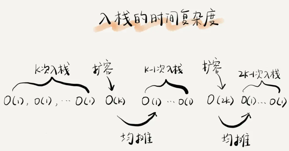 如果按之前的数组扩容时的操做(重新申请更大的空间,将原本数据复制过去)来计算入栈时间复杂度:最好情况O(1),最坏O(n)。均摊复杂度O(1)。