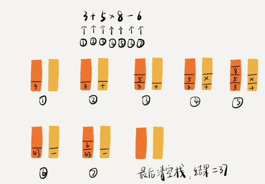 如果>顶元素优先级,入栈;相反<=,取出栈顶运算符,再从操作数栈栈顶取2个操作数计算的结果压入操作数栈中,继续比较。