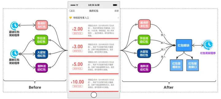 在返还购APP里有个【我的红包】的功能,用户的红包数据来自多个业务,如:邀请新用户注册领取100元红包,大促活动双倍红包,等各种活动红包,多个活动业务都实现了一套不同规则的红包领取和红包奖励发放的机制,导致红包不可管理,不能复用,难维护难拓展