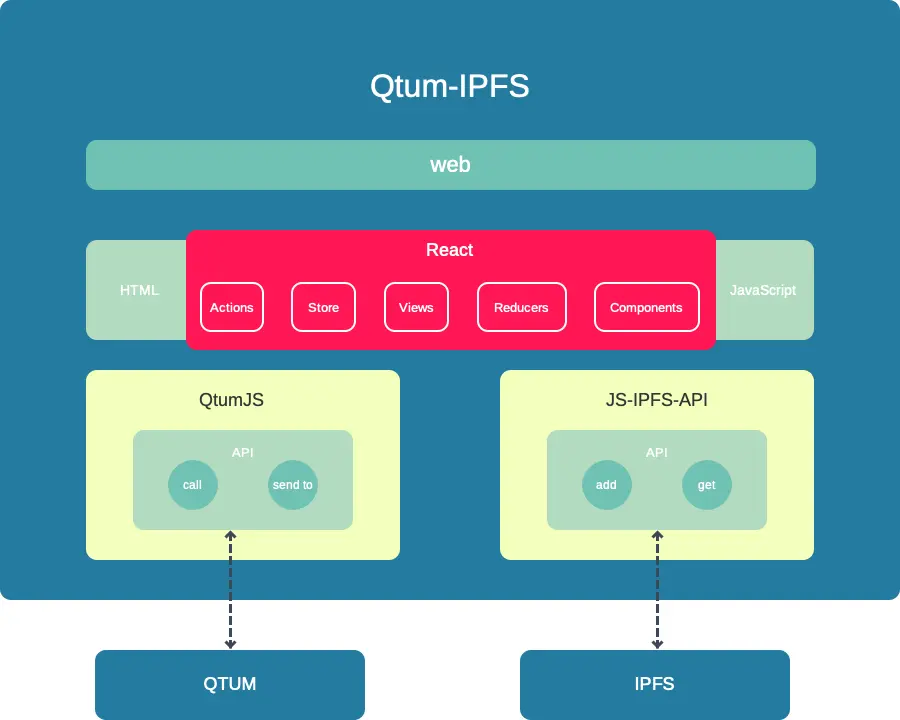 上层:基于React框架,以HTML+JS的方式运行在浏览器中,用户可以通过网页访问本系统。上层系统通过QtumJS和JS-IPFS-API两个组件和下层进行通信。QtumJS通过call接口访问Qtum中的智能合约,通过send to接口向智能合约发送交易;JS-IPFS-API通过add接口向IPFS网络中添加文件,通过get接口从IPFS网络中获取文件内容。