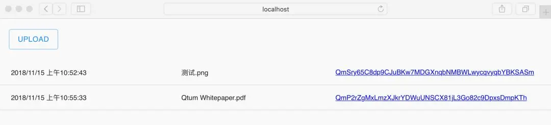 系统的使用很简单,当部署成果之后,只需要在浏览器中访问http://localhost:3000/,点击UPLOAD即可上传文件,按钮下方将显示为智能合约中的记录。