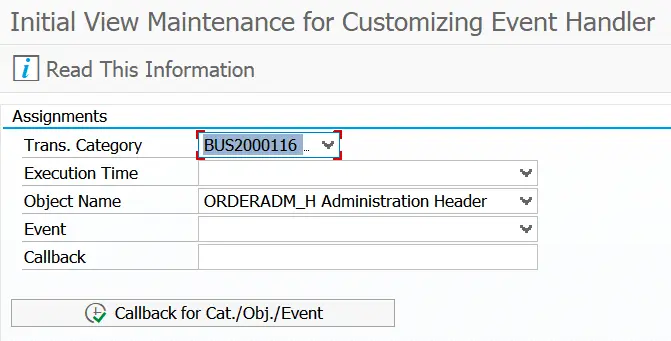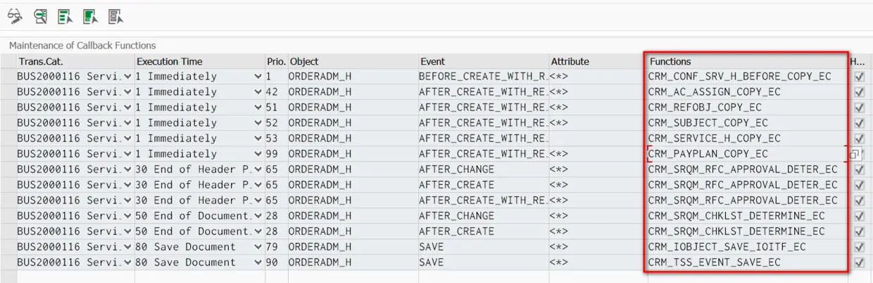 下图第一列红色的Execution Time,表示这些分配的函数到底是事件触发后立即执行,还是延迟到订单抬头或者行项目的通用例程执行完后再执行(往往用于实现批量操作,或者待执行函数同通用例程存在依赖关系,或者出于性能考虑)。