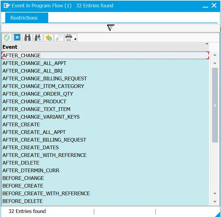 第三列Event,就是观察者-发布者模式里的事件了,下面是SAP CRM订单框架一些标准的事件: