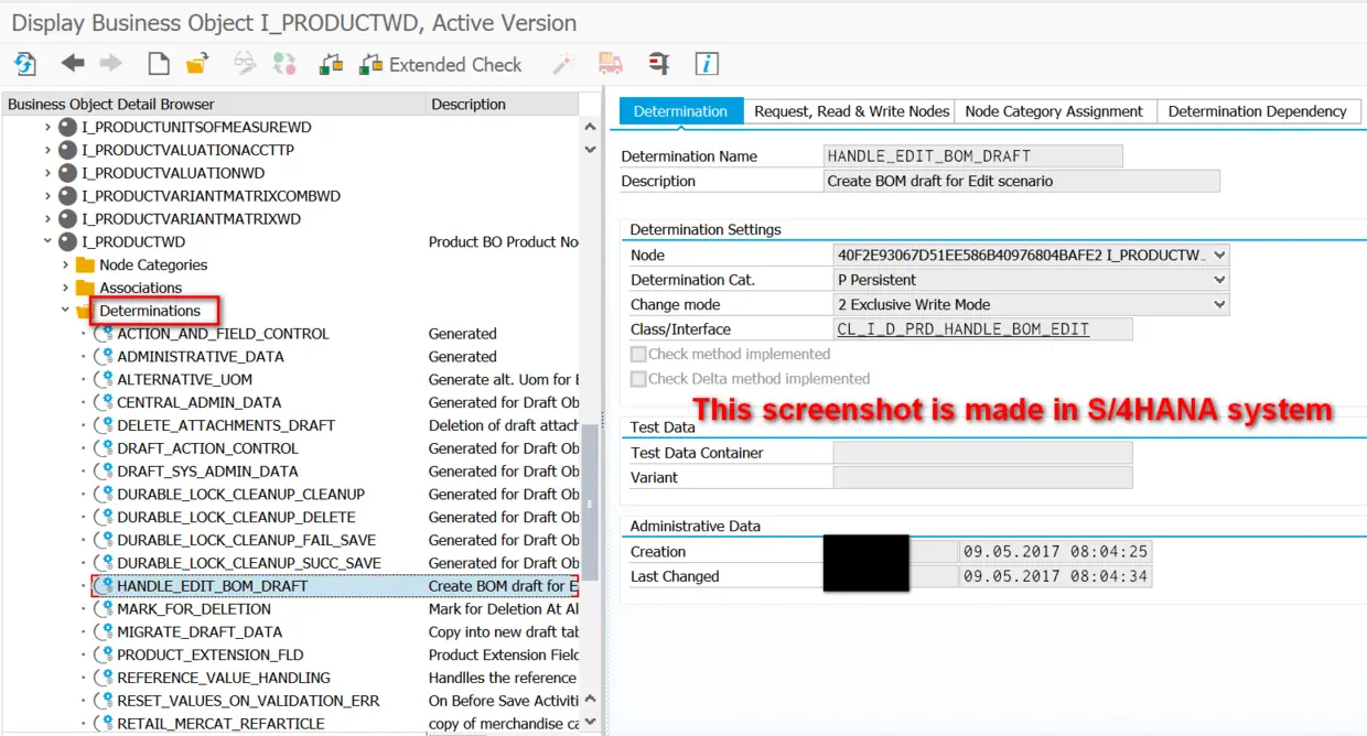 Partners可以在这些Hook里进行业务功能增强。有些Hook可能存在某些读写限制,比如AfterLoading这个Hook,会在SAP BO的标准加载逻辑执行完毕后被调用,在这个Hook的实现里,SAP不允许任何对BO节点标准字段的写操作,以避免Partners的增强对SAP标准流程可能带来的影响。有的顾问朋友可能会说,这些Hook不就是SAP Netweaver里传统的Business AddIn(BAdI)么?没错,概念上可以这么理解,需要提醒的就是,这些Hook创建之后,在ABAP后台并不是以BAdI Implementation的方式存储,而是以ESF2 Determination的方式存储,类似下图这种BOPF里的Determination:
