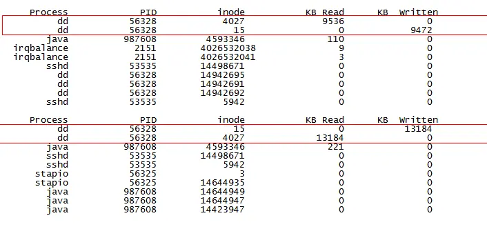 可以看到读写最多进程。但是现有脚本不能看到dd命令读文件和写文件的inode,需要自己扩展一下脚本,脚本扩展后如下图: