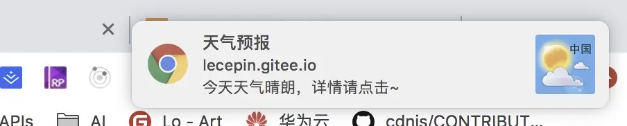 Notification.permission,获取当前用户对通知的权限。值:- granted:用户已授权显示系统通知。