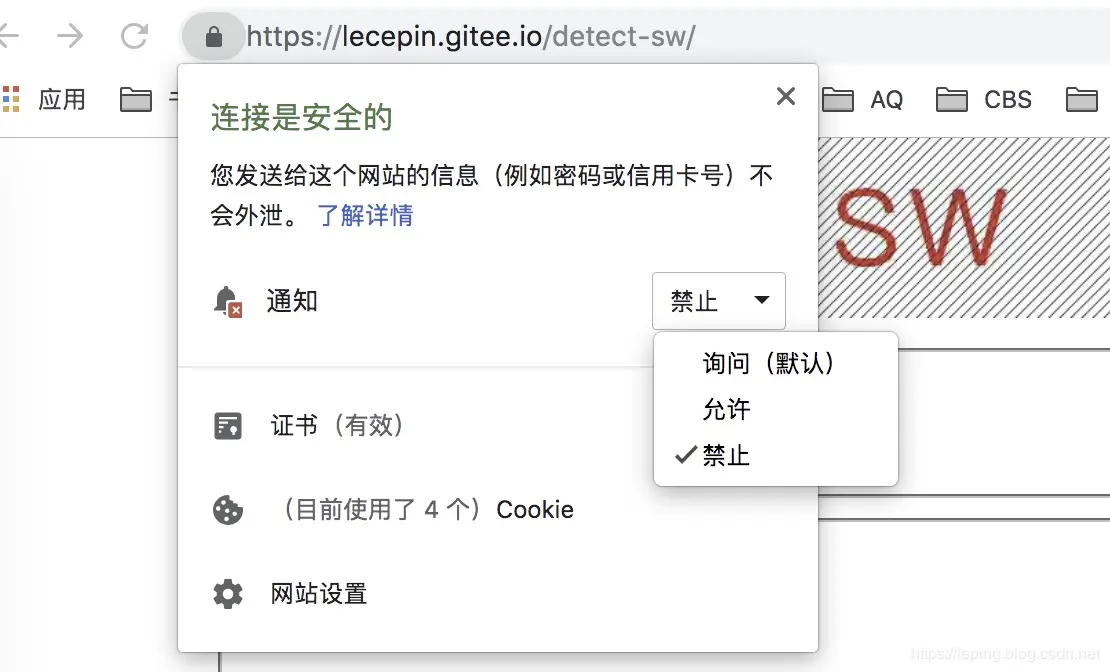 当前 permission 为 denied 时,直接返回 Promise,执行 catch 后面的代码。后续一直是拒绝状态,不再弹出授权框。此时 serviceWorker pushManager 不可用,订阅会抛出错误。此状态下,只能通过用户自己去修改权限。