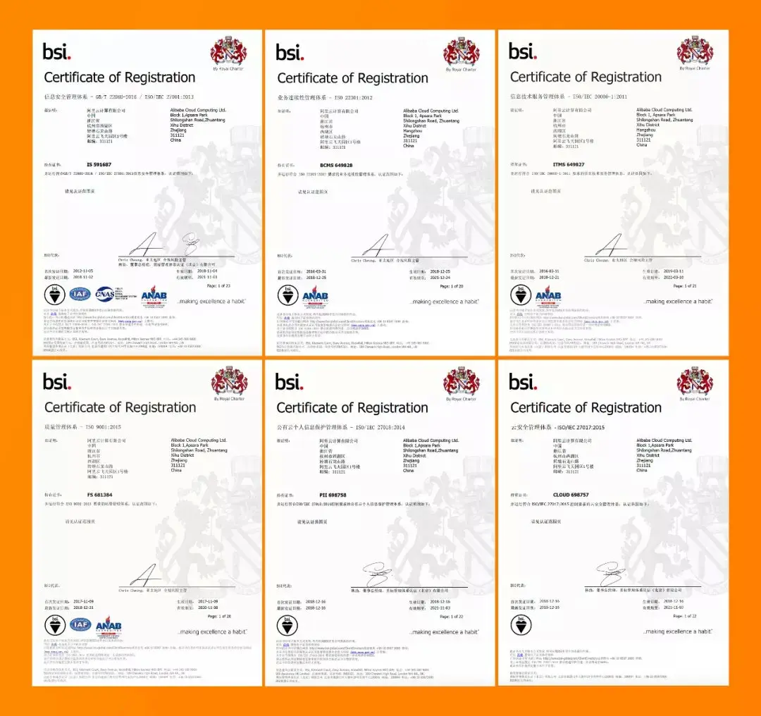 经过对阿里云管理体系认证审核和持续监督审核,我们高兴地看到,阿里云管理体系内的各类业务活动、产品和服务能力,包括国内外的场所,均符合ISO相关管理体系标准要求,这说明阿里云在安全性、稳定性、合规性上均达到国际先进标准的要求。