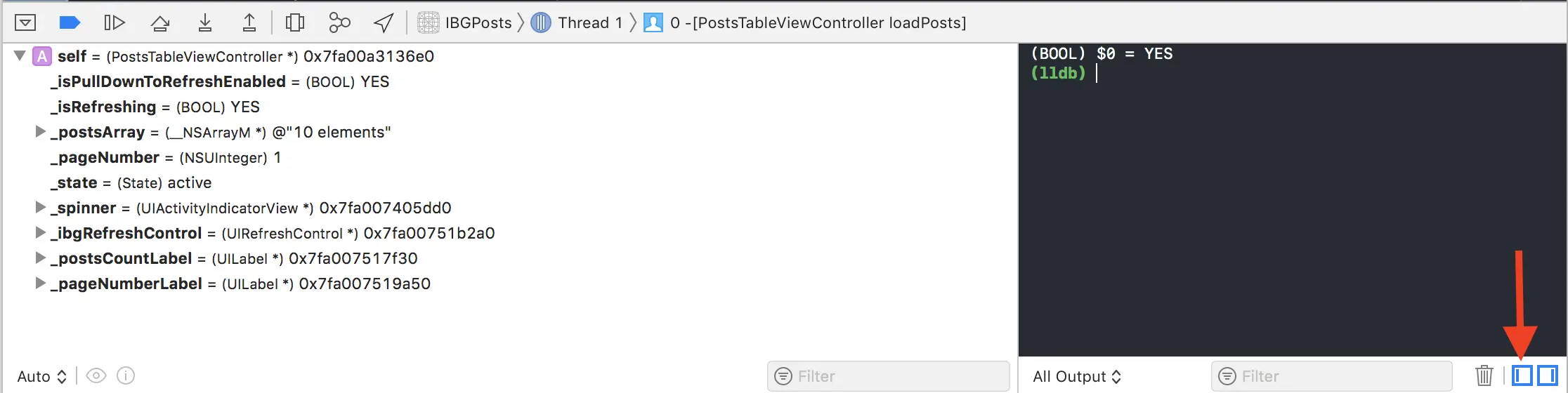 在底部的调试器窗口,点击“展示变量视图按钮”。接着就会滑出一个包含了 PostsTableViewController 所有属性的视图。